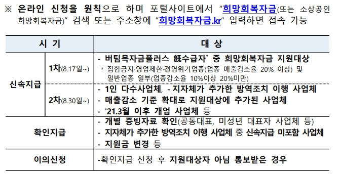 여기서 중요한 것은 희망회복자금 지원대상에 해당된다고 모두 8월 17일부터 신청을 할 수 있는 것이 아니며, 17일부터는 1차 신속 지급 대상자만 신청을 할 수 있다는 점 참고하시기 바랍니다.